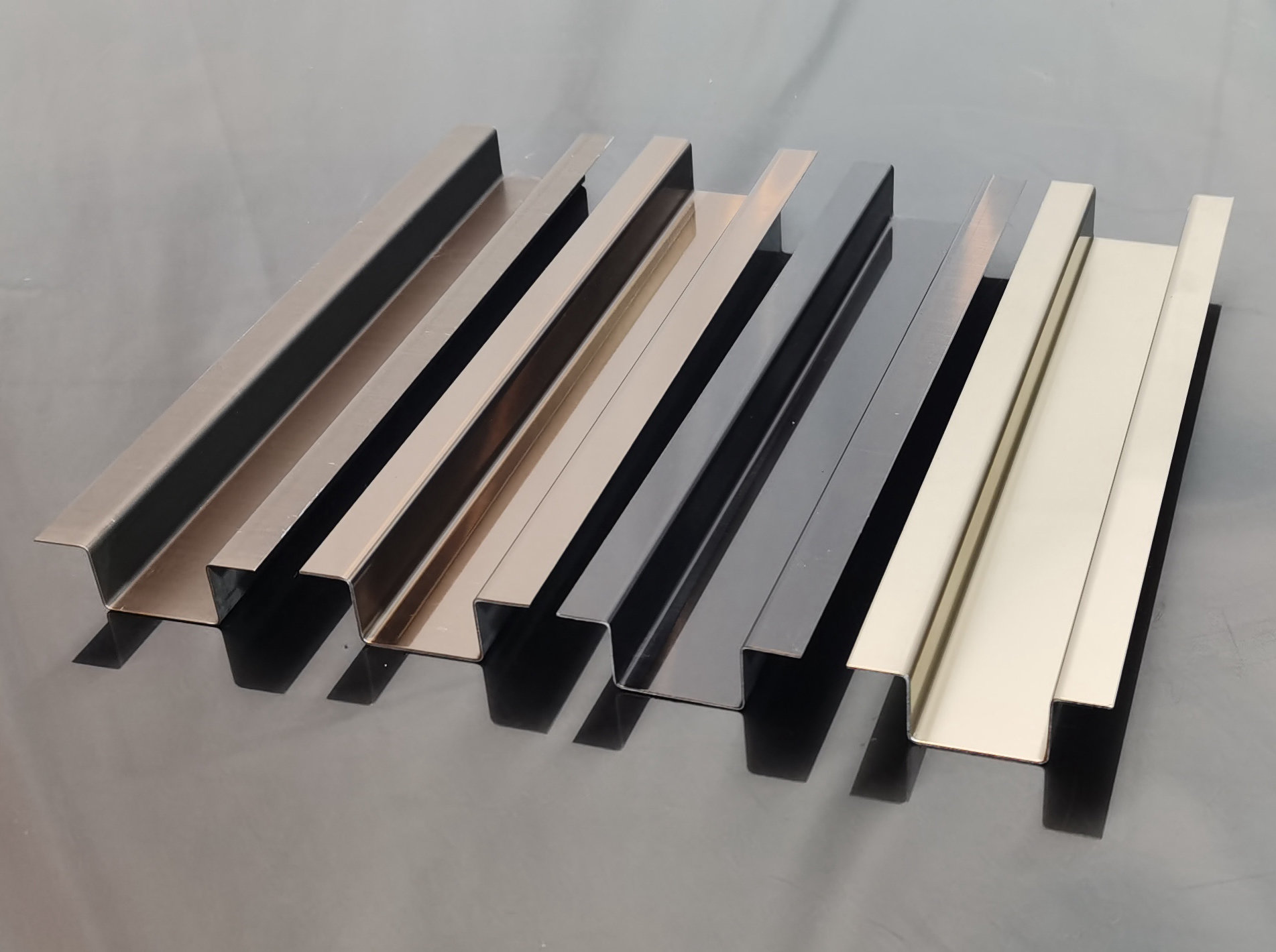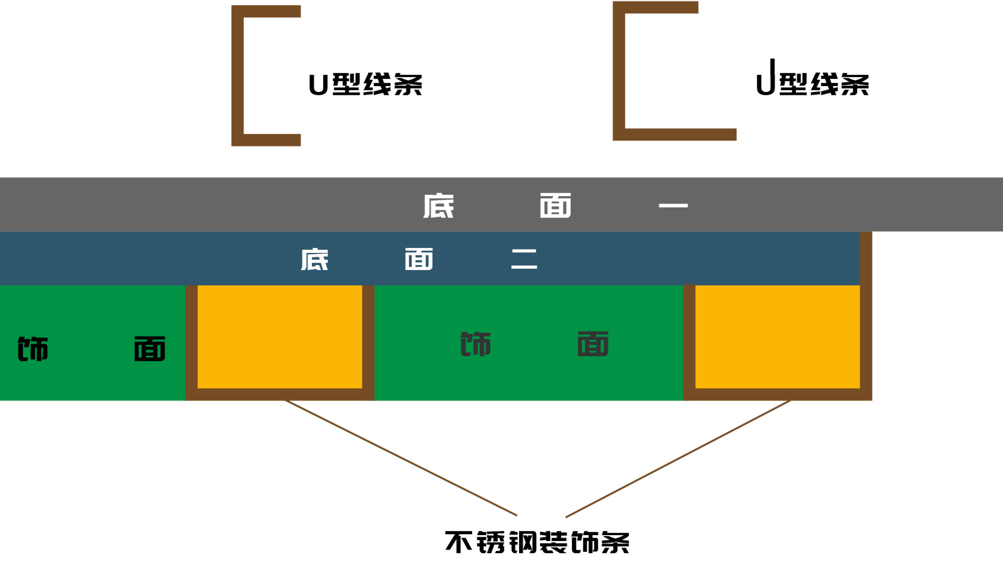 U型條常有2種:兩邊對等的U型和兩邊長短不一的U型。平面采用兩側等效的U形金屬線,左右兩側無高差;而兩邊長度不一致的U型金屬線條常用于左右兩邊有高低差的造型收口中,由于高差的不確定性,大部分需要現場定制。